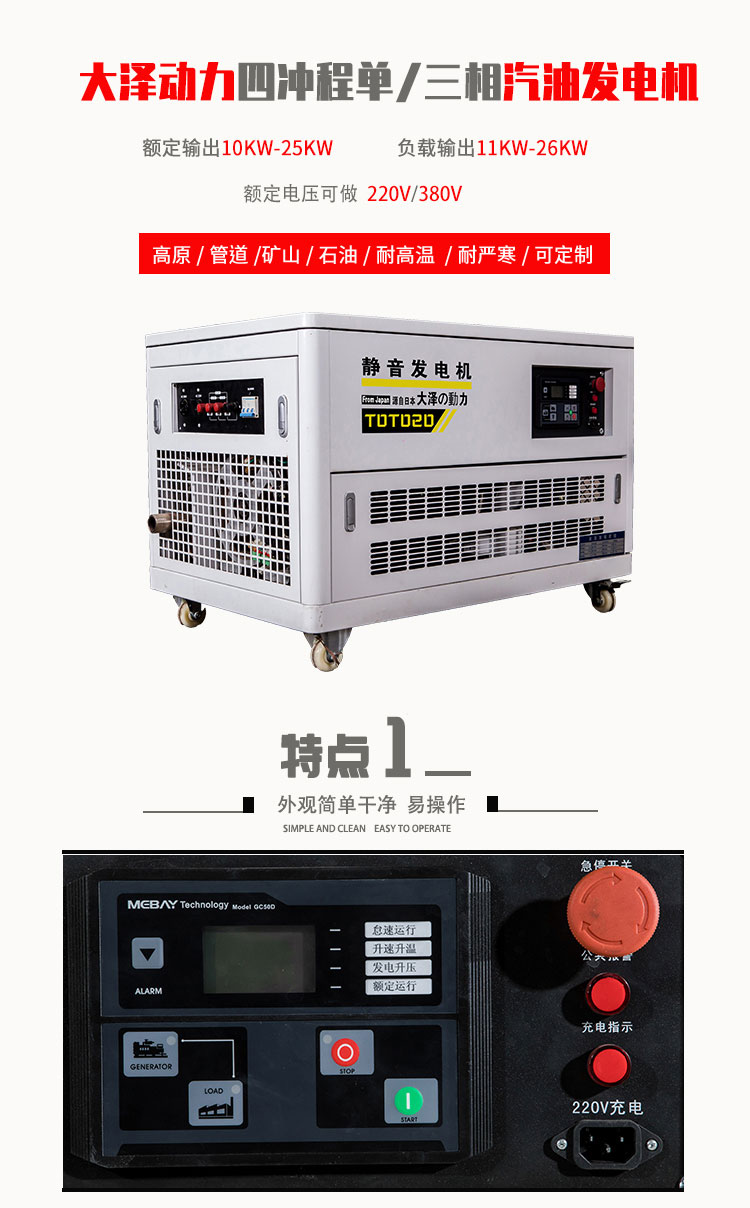 移動式20千瓦汽油發(fā)電機防雨防塵隨時為用戶供給不同功率的備用發(fā)電機租借,電力供應(yīng)足夠,為各項工地施工、工廠錯峰用電、酒店、大型市、救急用電。大澤發(fā)電機嚴厲依照ISO9001質(zhì)量管理體系的要求,選用的出產(chǎn)工藝和的測驗辦法,充分確保了產(chǎn)質(zhì)量量,一起贏得了很多用戶的認同和信任。業(yè)務(wù)規(guī)模遍及軍工,發(fā)電,石油,鋼鐵,水利,化工,電力,礦山,紡織和輕工等許多職業(yè)。