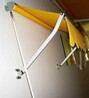 [工作方式]: 系統利用電機帶動鋁合金卷管轉動,使卷饒在卷管上的面料上升,下降,同時靠中間橫桿使得上部的面料為垂直式,靠手臂上的氣壓桿作用力將面料繃緊并使其伸出,另外系統大開啟角度為0~130度,可通過開關,遙控風光控等多種控制方式操作。