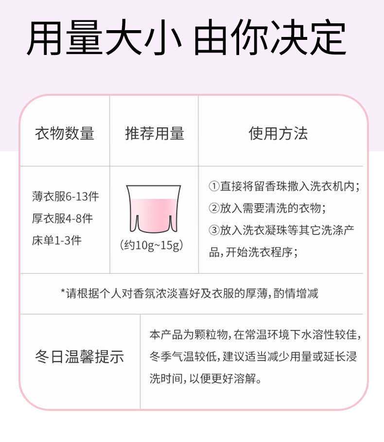 推薦用量:薄衣服6-13件一瓶蓋,厚衣服4-8件一瓶蓋,可根據(jù)個(gè)人對(duì)香氛的濃淡喜好以及衣物厚度,進(jìn)行適量增減