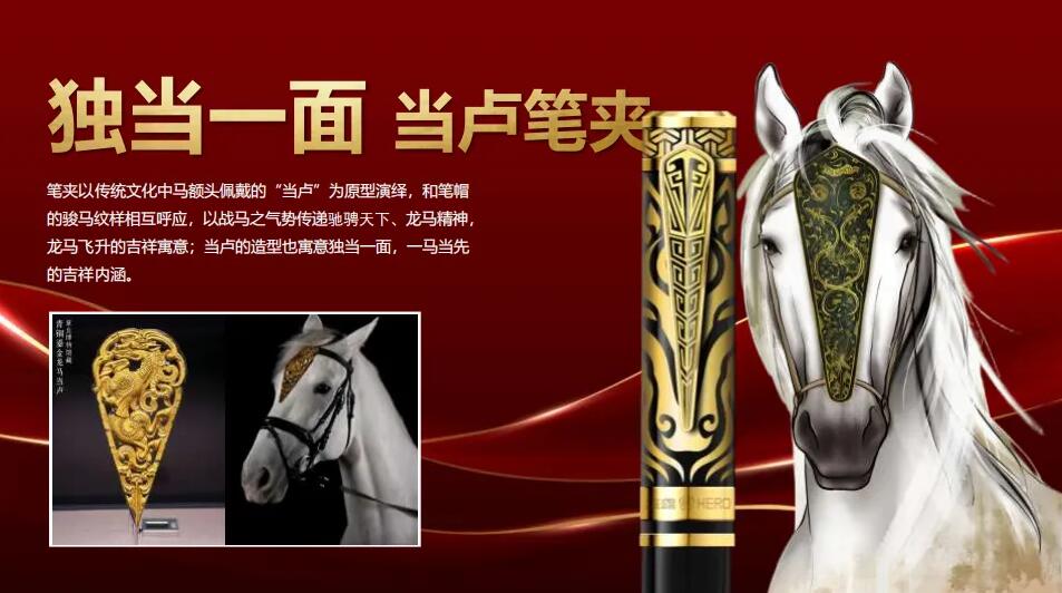 筆夾以傳統(tǒng)文化中馬額頭佩戴的“當(dāng)盧”為原型演繹,和筆帽的駿馬紋樣相互呼應(yīng),以戰(zhàn)馬之氣勢(shì)傳遞馳騁天下、飛升的吉祥寓意;當(dāng)盧的造型也寓意當(dāng)一面,一馬當(dāng)先的吉祥內(nèi)涵。