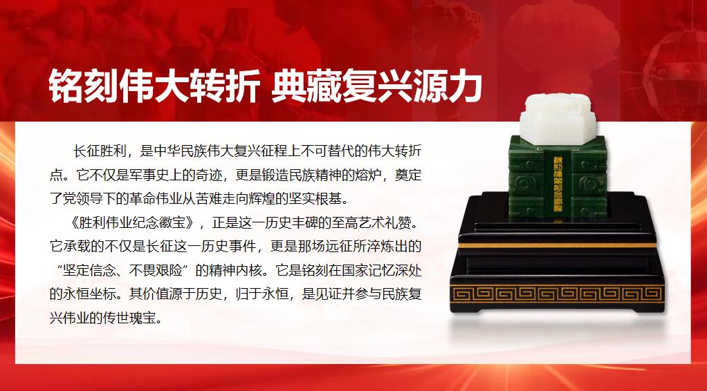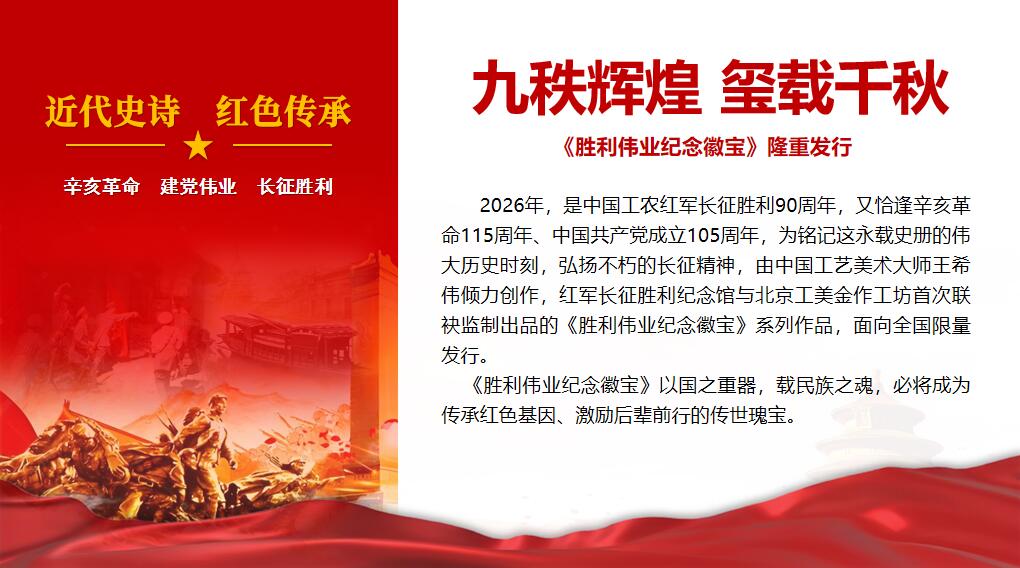 2026年,是中國(guó)工農(nóng)紅軍長(zhǎng)征勝利90周年,又恰逢辛亥革命115周年、為銘記這永載史冊(cè)的偉大歷史時(shí)刻,弘揚(yáng)不朽的長(zhǎng)征精神,由中國(guó)工藝美術(shù)大師王希偉傾力創(chuàng)作,紅軍長(zhǎng)征勝利紀(jì)念館與北京工美金作工坊聯(lián)袂監(jiān)制出品的《勝利偉業(yè)紀(jì)念徽寶》系列作品,面向全國(guó)發(fā)行。