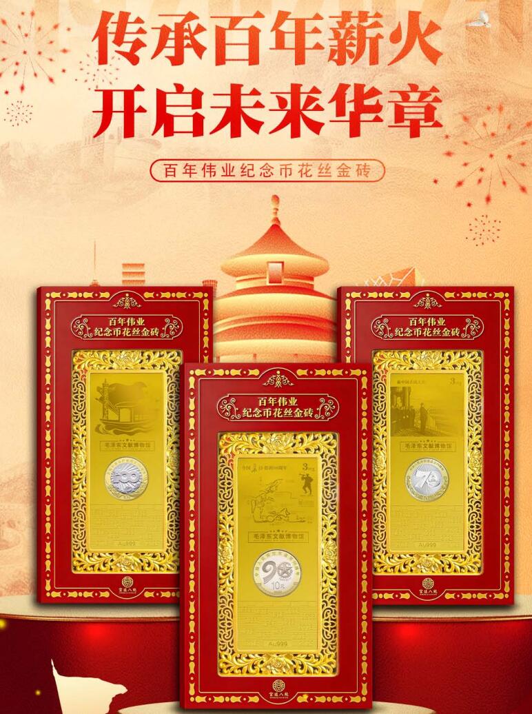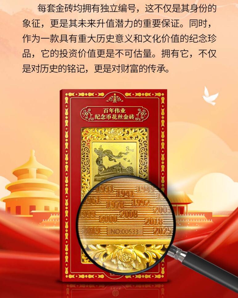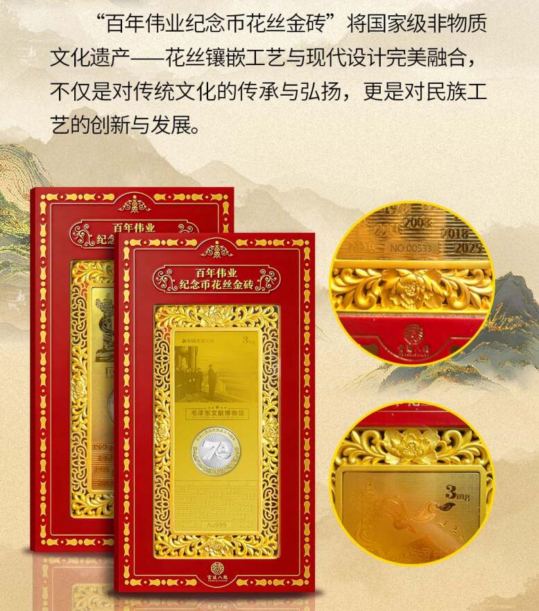 奮斗歷程,我們特別推出“偉業(yè)紀(jì)念幣花絲金磚”。這款產(chǎn)品將現(xiàn)代造幣工藝與傳統(tǒng)花絲鑲嵌技藝結(jié)合,是對(duì)偉業(yè)的好致敬,也是值得世代珍藏的藝術(shù)瑰寶。