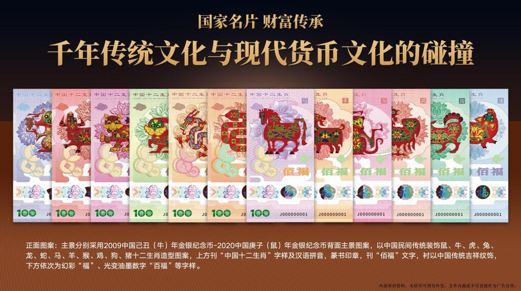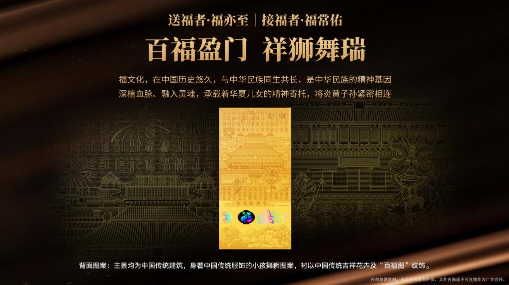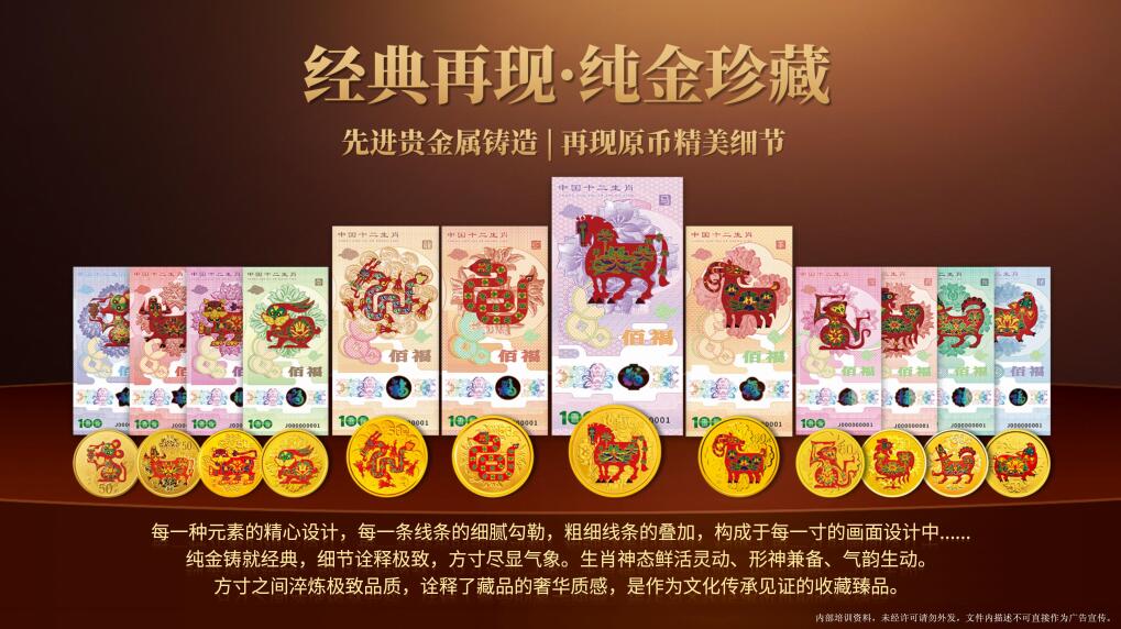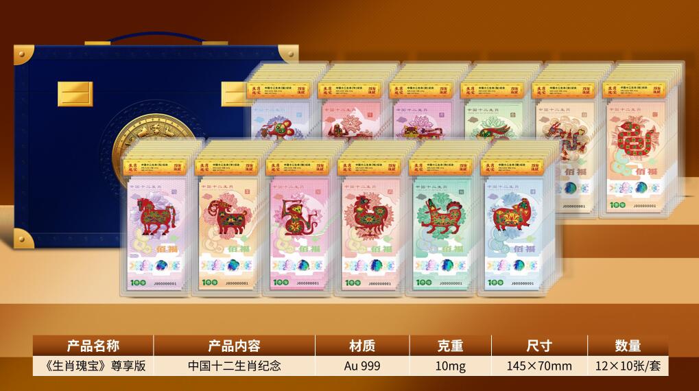 經(jīng)中國(guó)人民銀行圖樣行政許可,定于2026年3月1日起陸續(xù)發(fā)行《生肖瑰寶》中國(guó)十二生肖紀(jì)念金1套,正面分別選用2009至2020中國(guó)金幣總公司生肖金銀幣“主景圖樣”,上方刊“中國(guó)十二生肖”字樣及漢語拼音,篆書印章,并刊“佰福”字樣,襯以中國(guó)傳統(tǒng)吉祥紋飾,下方依次為幻彩“福”,光變數(shù)值“100”、編碼等字樣,背面圖案均為中國(guó)傳統(tǒng)建筑,身著中國(guó)傳統(tǒng)服飾的兒童、舞獅圖案,并標(biāo)注材質(zhì)、成色及克重字樣,該產(chǎn)品是千年生肖文化與現(xiàn)代貨幣文化的碰撞,更以貴金屬造幣工藝,再現(xiàn)原幣經(jīng)典,紀(jì)念意義與收藏價(jià)值。
