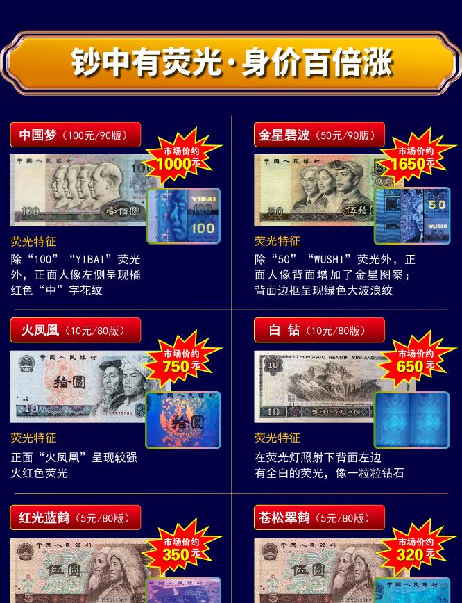 熒光鈔在收藏界被譽為“測試鈔”和“神秘紙幣”,了我國熒光鈔先河,品種豐富,版本多樣,數量極少,收藏價值非常大!