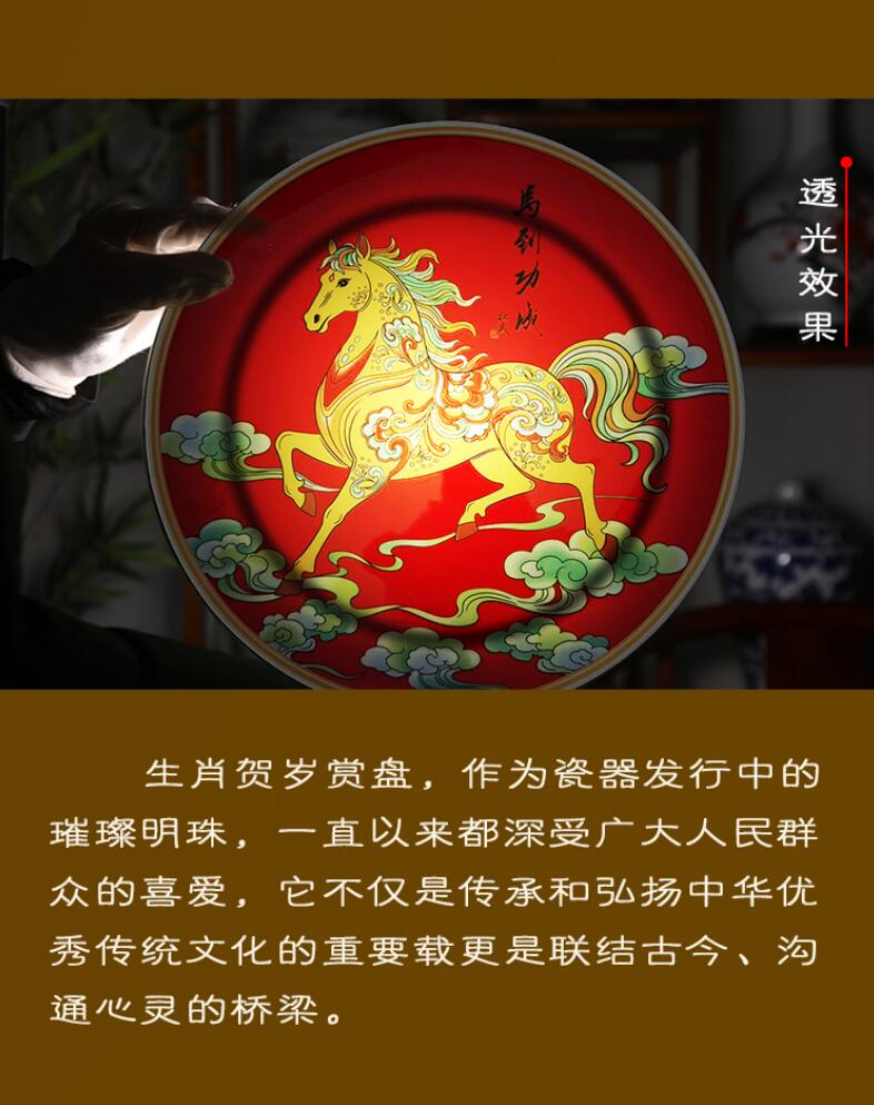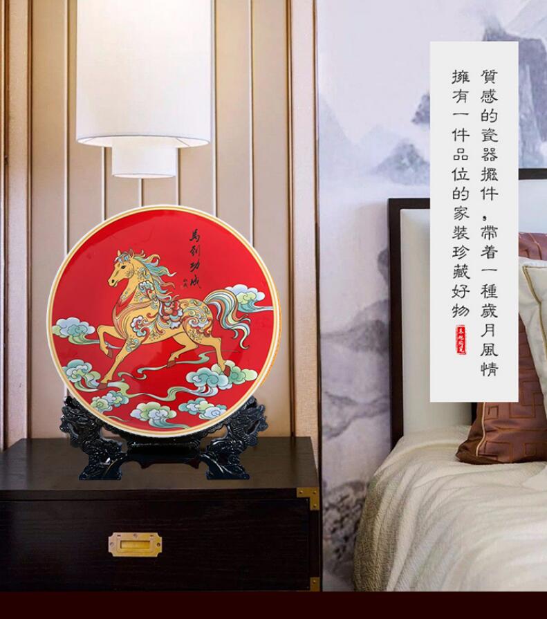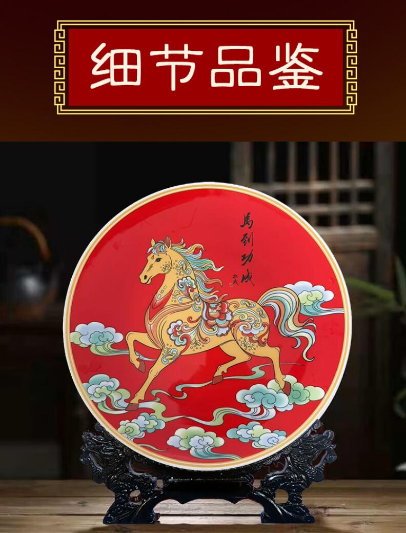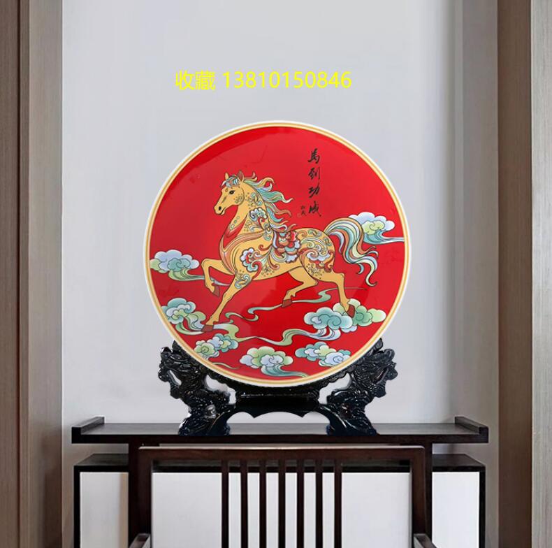 這件賞盤以中國紅為底,金彩繪馬,祥云環(huán)繞,色彩濃烈喜慶,融合了傳統(tǒng)工筆重彩與現(xiàn)代裝飾審美。駿馬身姿矯健、紋飾華麗,寓意事業(yè)騰飛、前程似錦,是2026馬年的吉祥獻禮。