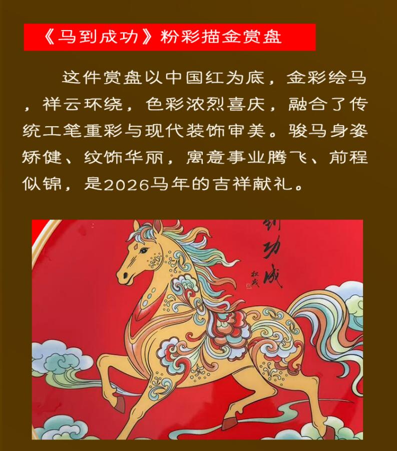 為紀念2026年丙午馬年新春,國瓷張松茂大師創(chuàng)作《馬到成功》生肖賀歲賞盤,主畫面以中國紅為底,金彩繪馬,祥云環(huán)繞,駿馬身姿矯健、紋飾華麗,寓意事業(yè)騰飛、前程似錦。