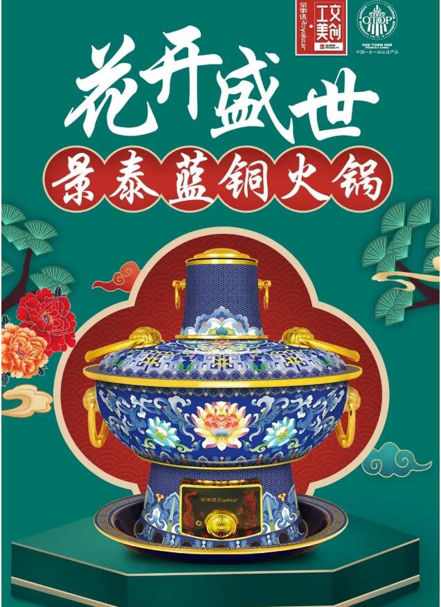 “花開盛世”景泰藍(lán)銅火鍋,制作工藝極為復(fù)雜,每個(gè)鍋需要8道工序薈萃,藍(lán)色交疊的祥云與富貴花的斑斕圖案相映襯,濃濃的宮廷風(fēng)頂蓋上輕煙裊裊,別是一番意趣。