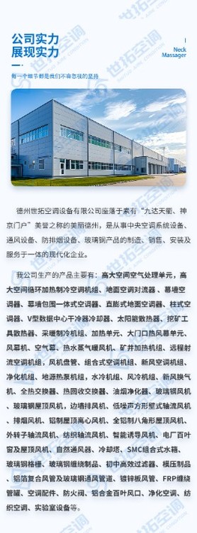 德州世拓空調(diào)設(shè)備有限公司,公司占地面積500畝,員工400人。本公司始終奉行以“質(zhì)量求生存、以信譽(yù)求發(fā)展”的企業(yè)宗旨,經(jīng)合肥機(jī)械研究院檢驗(yàn),各項(xiàng)指標(biāo)均達(dá)到或超過國(guó)家標(biāo)準(zhǔn),公司大量引進(jìn)數(shù)控自動(dòng)化生產(chǎn)設(shè)備,成功推出中央空調(diào)末端系列。中央空調(diào)主機(jī)(空氣源熱泵、地源熱泵、水源熱泵、風(fēng)冷模塊機(jī)組)螺桿式水、地源熱泵機(jī)組、渦旋式水、地源熱泵機(jī)組、滿液式水、地源熱泵、箱體式水、地源熱泵、風(fēng)冷螺桿機(jī)組、水冷螺桿機(jī)組、水冷冷水機(jī)組、膨脹機(jī)、恒溫恒濕機(jī)組、食用菌機(jī)組、空氣源熱泵熱水機(jī)、風(fēng)機(jī)盤管、新風(fēng)換氣機(jī)、空調(diào)機(jī)組、風(fēng)幕機(jī)、暖風(fēng)機(jī)等末端設(shè)備配件