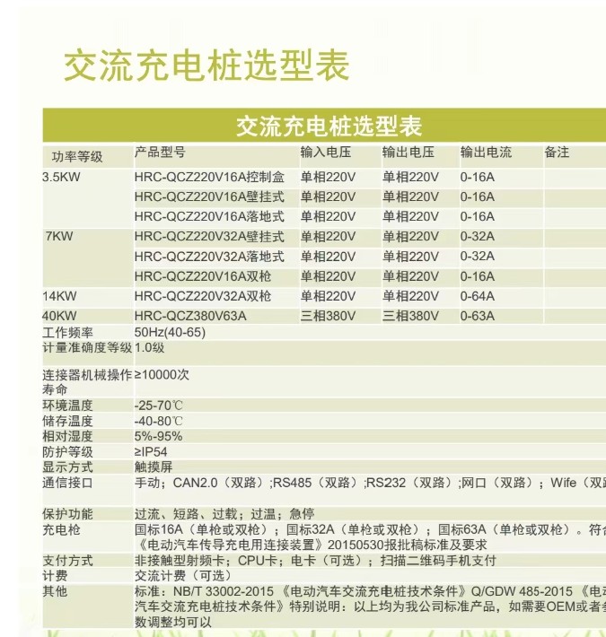 電動汽車交流充電樁選型表: