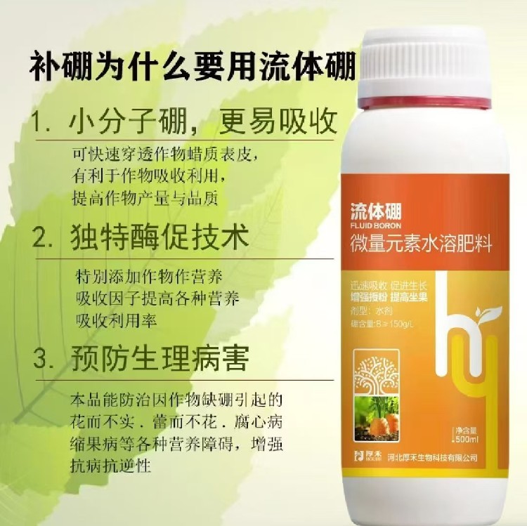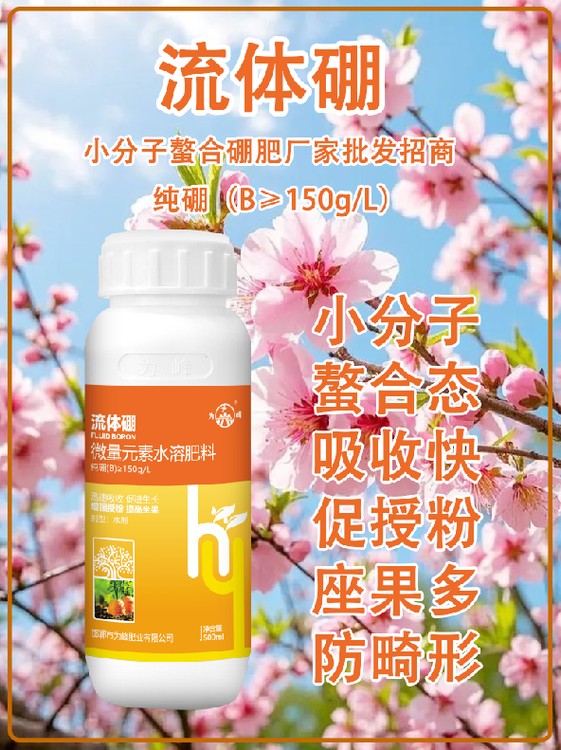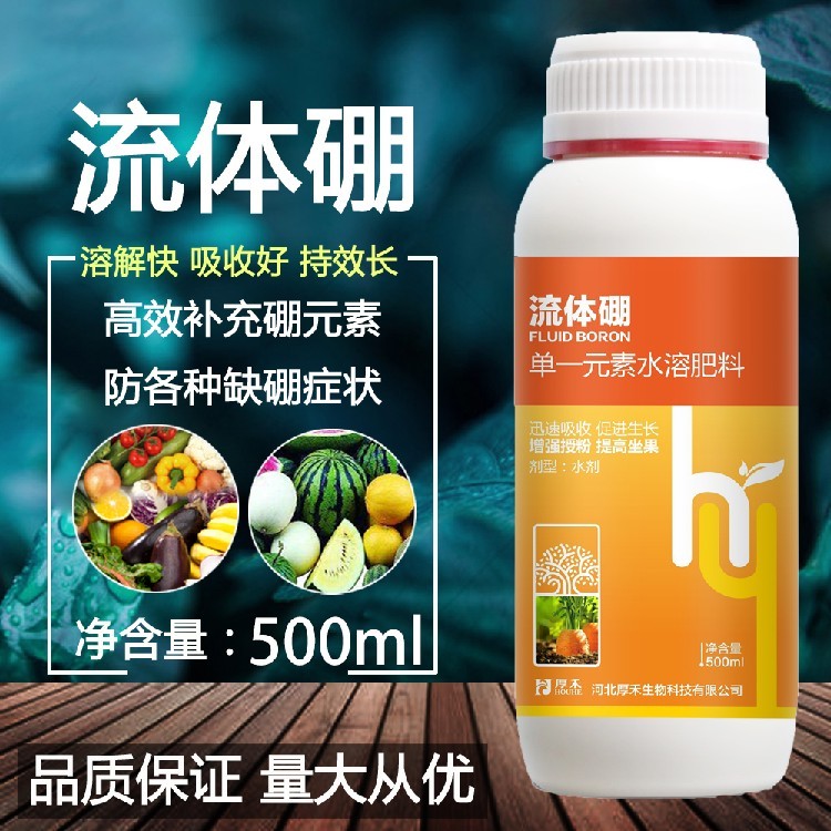 流體硼葉面肥通常為中性或弱酸性,具有良好的兼容性和穩(wěn)定性,能與大多數殺蟲劑、殺菌劑以及中微量元素葉面肥(如鉬酸銨、硫酸鋅等)混合噴施。這為農業(yè)生產的“一噴多效”、“藥肥混用”提供了便利。在一次施藥作業(yè)中,同時完成病蟲害防治和硼營養(yǎng)補充,既節(jié)省了單獨噴施的人工和機械成本,提高了作業(yè)效率,又能通過協(xié)同作用增強效果。例如,在防治油菜菌核病時加入流體硼,既能補硼保果,硼增強細胞壁的作用也可能輔助降低病害侵染。這種省工增效的特點使其在現代集約化、規(guī)?;r業(yè)管理中尤其受歡迎。