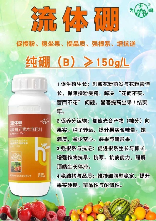 流體硼對提高作物授粉受精成功率具有的作用。硼能刺激花粉管的萌發(fā)和伸長,確?;ǚ酃茼樌竭_子房完成受精。在油菜、果樹、瓜類、豆類等作物花期,噴施流體硼可顯著增加花粉活力和花粉管長度,使授粉更充分,有效減少因授粉不良引起的“花而不實”、蕾鈴脫落、幼果畸形等現象。這對于在低溫、陰雨、干旱等不良天氣下保障坐果率尤為重要。它提高了有效花、有效果的比例,直接增加了單株結果數,是保花保果、提高產量的關鍵措施,尤其對需硼量大的作物效果極為顯著。