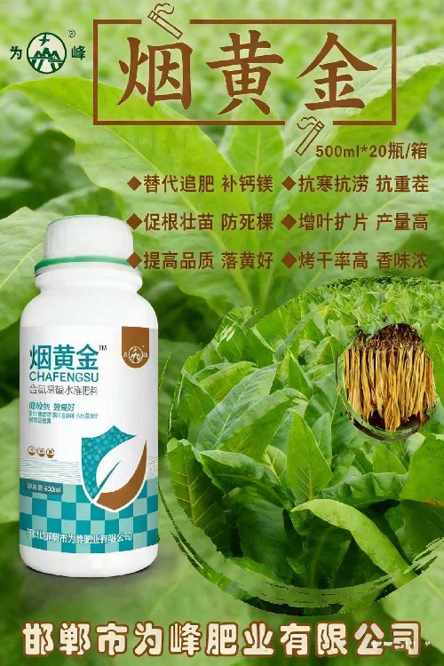 為峰煙黃金葉面肥是適配煙草全生長(zhǎng)周期的肥料,以甲殼低聚糖、氨基酸及多種中微量元素為主要成分,科學(xué)復(fù)配、無激素添加,安全溫和,適配各類煙草品種,集促長(zhǎng)、抗病、抗逆、提質(zhì)、增產(chǎn)于一體。噴施后可補(bǔ)充煙株?duì)I養(yǎng),促進(jìn)根系生長(zhǎng),增強(qiáng)吸收能力,破解缺素引發(fā)的生長(zhǎng)癥結(jié),讓煙株長(zhǎng)勢(shì)健壯、整齊一致;增強(qiáng)抗逆能力,減少環(huán)境和重茬帶來的損傷;提升免疫力,預(yù)防常見煙草病害,減少農(nóng)藥使用量;調(diào)節(jié)植株代謝,優(yōu)化煙葉落黃效果,提升烤后品質(zhì)與香氣,助力種植戶降低成本、提質(zhì)增產(chǎn)。