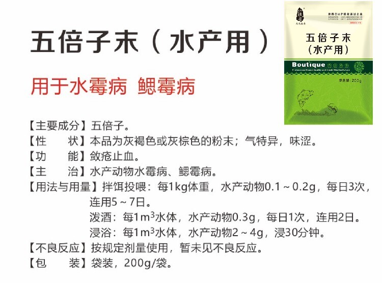 五倍子用于水霉病防治主要是收斂作用,可以促進水霉菌感染傷口的愈合,但是五倍子末也不能殺滅病原真菌。