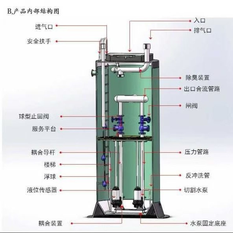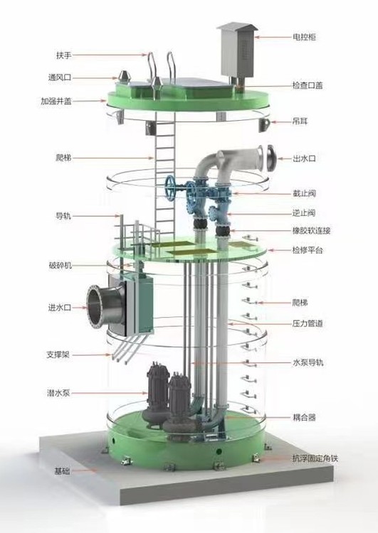 玻璃鋼一體化污水提升泵站具有體積小、、防腐蝕、防滲漏、智能化等特點(diǎn)。與傳統(tǒng)泵站相比土建工程量少、制造安裝周期短、投資可減少一半以上。泵站安裝方便、質(zhì)量可靠,是傳統(tǒng)混凝土污水提升泵站的替代品。