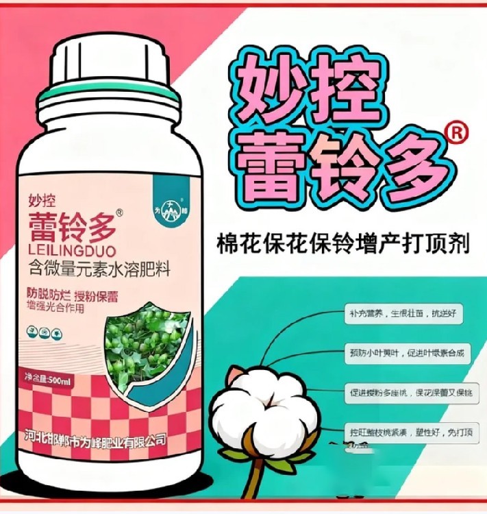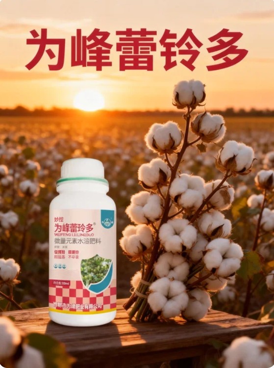 為峰蕾玲多棉花高產(chǎn)種植,離不開科學(xué)的控旺與營養(yǎng)管理,蕾鈴多棉花控旺免打頂葉面肥應(yīng)運(yùn)而生。該葉面肥集控旺、免打頂、補(bǔ)營養(yǎng)、促增產(chǎn)于一體,配方科學(xué)合理,適配棉花生長特性。噴施后可快速抑制徒長,平衡營養(yǎng)分配,塑造緊湊健壯的株型,無需人工打頂,省時省力。同時補(bǔ)充硼、鉀等微量元素,促進(jìn)花芽分化與授粉,提高座桃率,減少蕾鈴脫落,增加結(jié)鈴量,促進(jìn)棉桃膨大早熟,延緩早衰,改善纖維品質(zhì),增強(qiáng)抗逆能力,助力棉農(nóng)輕松實(shí)現(xiàn)棉花高產(chǎn)增收。?
