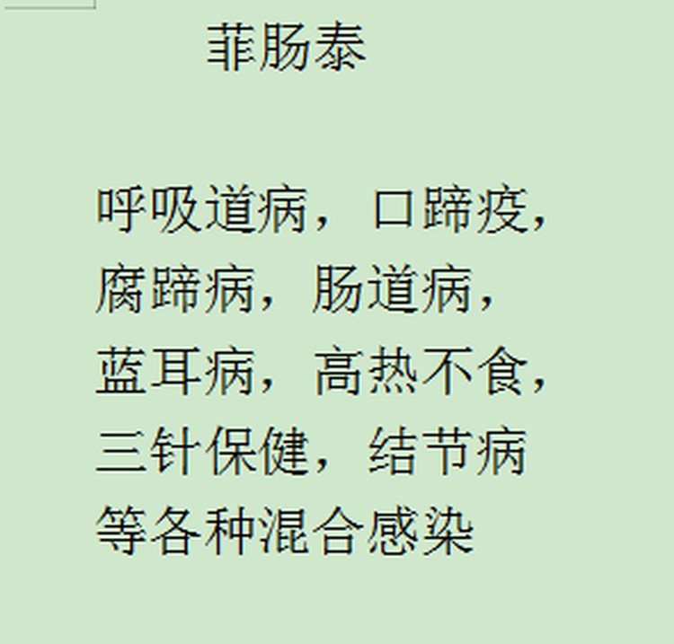 菲腸泰:呼吸道病,口蹄疫,腐蹄病,腸道病,藍(lán)耳病,高熱不食,三針保健,結(jié)節(jié)病等各種混合感染