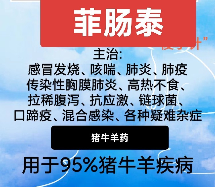 菲腸泰:呼吸道病,口蹄疫,腐蹄病,腸道病,藍(lán)耳病,高熱不食,三針保健,結(jié)節(jié)病,抗應(yīng)激等各種混合感染