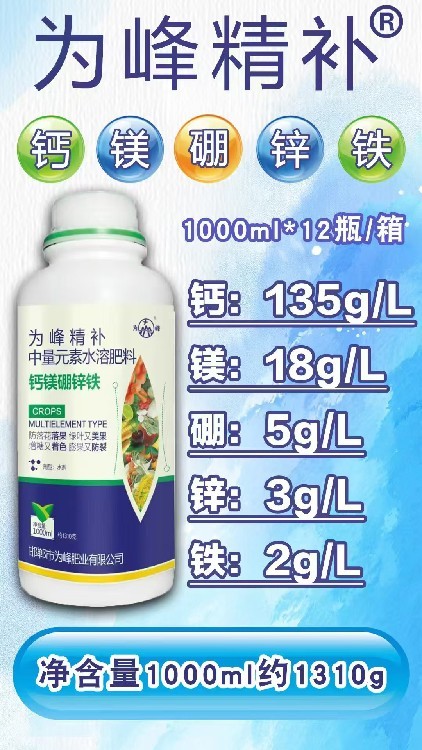 單一補(bǔ)肥易拮抗,吸收率低。為峰精補(bǔ)科學(xué)復(fù)配鈣鎂硼鋅鐵,元素間協(xié)同增效,減少相互拮抗。它能優(yōu)化作物根系與葉片營(yíng)養(yǎng)吸收環(huán)境,如同為作物打開營(yíng)養(yǎng)吸收的“高速通道”,顯著提高肥料利用率。一次施用,多效合一,避免重復(fù)作業(yè),省工省本,讓每一分錢都花在刀刃上,實(shí)現(xiàn)科學(xué)的營(yíng)養(yǎng)管理。