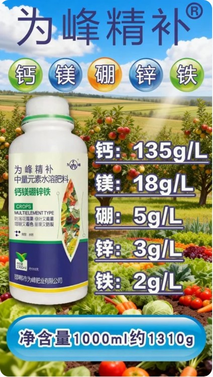 為峰精補(bǔ)鈣鎂硼鋅鐵,協(xié)同發(fā)力提升光合作用,促進(jìn)花芽分化與花果發(fā)育,實(shí)現(xiàn)作物全程優(yōu)質(zhì)生長(zhǎng)。鎂元素作為葉綠素關(guān)鍵成分,能快速改善葉片發(fā)黃、長(zhǎng)勢(shì)衰弱問題,顯著提升光合利用率,促進(jìn)養(yǎng)分轉(zhuǎn)化與積累,為花芽分化和作物生長(zhǎng)提供充足能量;硼元素調(diào)控花芽分化,促進(jìn)花芽飽滿、花期整齊,減少畸形花芽,提高坐果潛力;鈣元素強(qiáng)化植株細(xì)胞壁,增強(qiáng)植株韌性,鋅鐵補(bǔ)充微量元素,改善植株長(zhǎng)勢(shì),增強(qiáng)抗逆能力。多種元素科學(xué)配比、協(xié)同作用,既能解決作物光合不足、花芽分化差的問題,又能提升植株整體長(zhǎng)勢(shì),減少落花落蕾,為后續(xù)?;ū9⒐麑?shí)膨大奠定基礎(chǔ),適配各類經(jīng)濟(jì)作物與糧食作物,助力種植戶輕松實(shí)現(xiàn)苗期壯、花期齊、果期優(yōu)的種植目標(biāo)。?