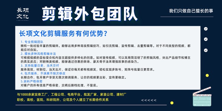 長項文化傳媒?人力咨詢行業(yè)批量 IP 打造:為咨詢公司、人力公司、會計事務所等企業(yè)提供批量短視頻剪輯服務,聚焦 IP 打造、行業(yè)科普、服務優(yōu)勢等內容,通過內容策劃與平臺規(guī)則把控,助力企業(yè)樹立行業(yè)形象,提升客戶咨詢與合作轉化率。