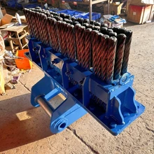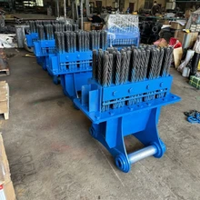 在運(yùn)輸狀態(tài),通過轉(zhuǎn)子升降油缸使轉(zhuǎn)子被抬起,罩殼支撐在轉(zhuǎn)子兩端的軸頸上,因此也被抬起;在工作狀態(tài),轉(zhuǎn)子通過轉(zhuǎn)子升降油缸被放下來,罩殼便支撐在地面上,此時,轉(zhuǎn)子軸頸則借助于罩殼兩側(cè)長方形孔內(nèi)的深度調(diào)節(jié)墊塊支撐在罩殼上。因此,在自身重量和轉(zhuǎn)子重量的共同作用下,罩殼緊緊地壓在地面上,形成一個較為封閉的工作室,拌和轉(zhuǎn)于在里面完成粉碎拌和作業(yè)。轉(zhuǎn)子架一般為框架結(jié)構(gòu),鉸接于車架的懸掛端部,用來支撐工作轉(zhuǎn)子并使轉(zhuǎn)子相對于地面作升降運(yùn)動。