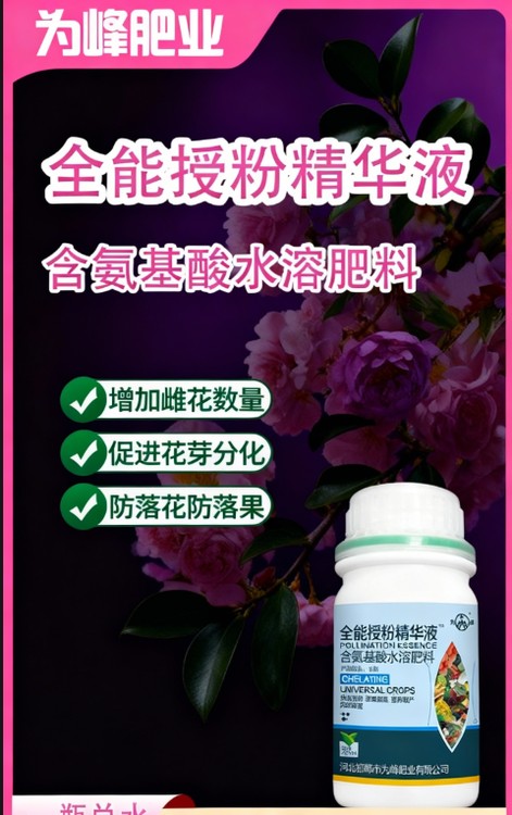 授粉精華液其含有的有機(jī)酸類物質(zhì)能調(diào)節(jié)花朵表面pH值,更利于花粉黏附與萌發(fā),優(yōu)化授粉步。精華液能改善花期病害的抵抗力,減少因真菌、細(xì)菌直接侵染花器導(dǎo)致的病理性脫落。能緩解因土壤鹽漬化、酸化等導(dǎo)致的果實(shí)口感變差問題,產(chǎn)出風(fēng)味正常的果實(shí)。在低溫下,它能促進(jìn)花粉中淀粉向可溶性糖轉(zhuǎn)化,為花粉管萌發(fā)提供即時能源,彌補(bǔ)低溫導(dǎo)致的能量代謝減緩。