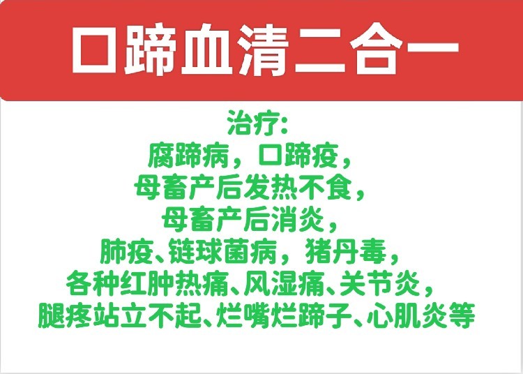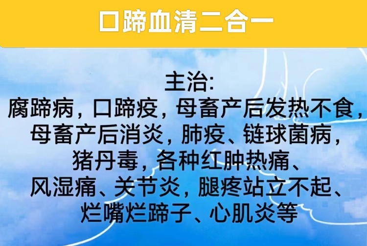蹄血清二合一:口蹄疫,腐蹄病、母豬牛羊產(chǎn)后發(fā)熱,肺疫,鏈球菌病,豬丹毒及各種豬牛羊紅腫熱痛,豬牛羊痛,關(guān)節(jié)炎,蹄病,心肌炎等。
