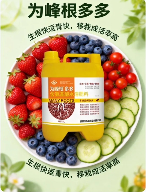 種植怕燒根、怕肥害,選根多多沖施肥,溫和,安全無憂!本品采用純生物發(fā)酵工藝螯合精制而成,富含十八種天然氨基酸、活性生根因子及生物刺激素,不含激素、不含重金屬,溫和無刺激,對(duì)作物、土壤無任何傷害,可放心使用。十八種氨基酸溫和補(bǔ)充營(yíng)養(yǎng),無需擔(dān)心濃度過高導(dǎo)致燒根,可直接被根系吸收,快速緩解作物缺素問題;生根因子溫和促根,不刺激根系,不徒長(zhǎng),讓作物根系自然健壯生長(zhǎng)。生物刺激素調(diào)節(jié)土壤,平衡土壤酸堿,活化土壤肥力,同時(shí)增強(qiáng)作物自身免疫力,減少病蟲害侵染,讓作物健康生長(zhǎng)。適用于各類作物全生長(zhǎng)期,無論是苗期、花期還是果期,沖施根多多,安全護(hù)根、補(bǔ)肥,讓種植戶無需擔(dān)心肥害問題,輕松種植。