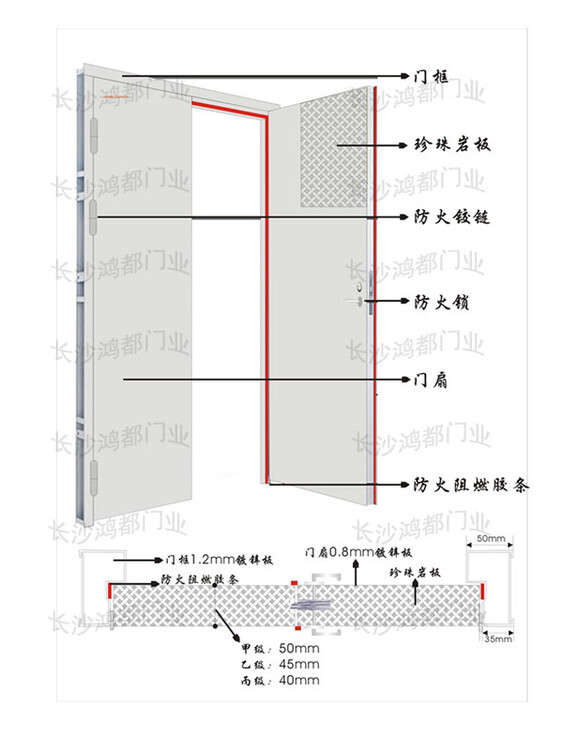 用鋼質(zhì)和難燃木質(zhì)材料或難燃木材制品制作門框、門扇骨架、門扇面板。
