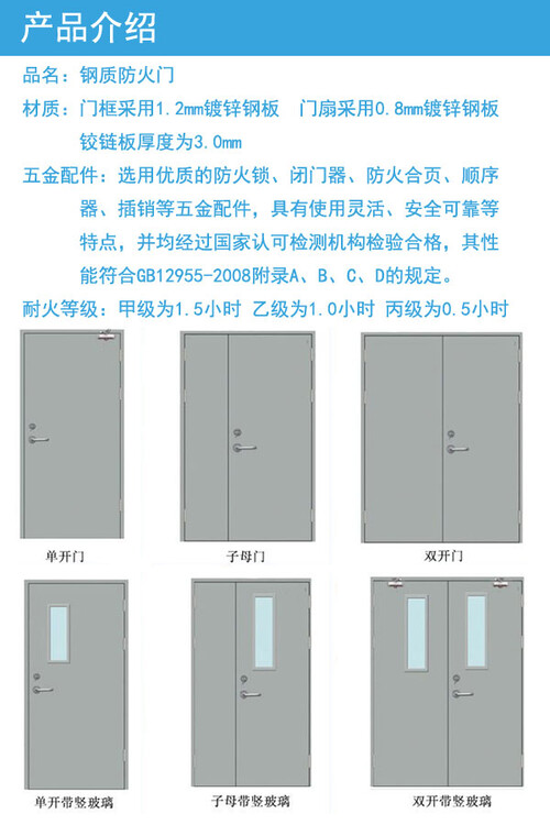用鋼質(zhì)材料制作門框、門扇骨架和門扇面板,門扇內(nèi)若填充材料,則填充對(duì)人體無(wú)害的防火隔 熱材料,并配以防火五金配件所組成的具有一定耐火性能的門。