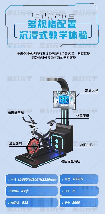 VR自行車是一款集騎行設(shè)備、VR交互技術(shù)、交通安全教育內(nèi)容為一體的沉浸式智慧體驗(yàn)裝置。它由實(shí)體自行車硬件、VR頭顯、大屏顯示系統(tǒng)與主控端組成,通過多點(diǎn)交互模擬真實(shí)騎行狀態(tài),讓體驗(yàn)者在虛擬環(huán)境中完成多類交通騎行場景訓(xùn)練。與傳統(tǒng)靜態(tài)安全教育相比,VR自行車能夠讓體驗(yàn)者在親身經(jīng)歷的沉浸體驗(yàn)中學(xué)習(xí)安全知識與騎行規(guī)范,從而實(shí)現(xiàn)更深入、更持久的認(rèn)知效果。