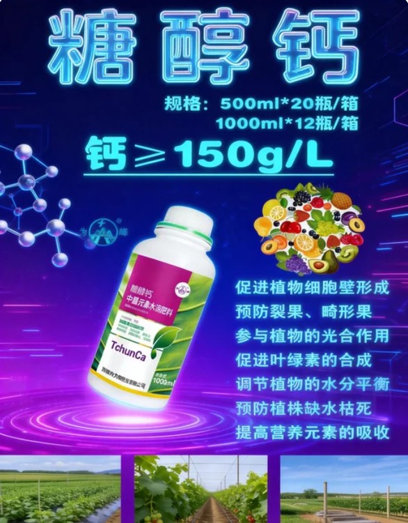 生根護根抗逆境,防裂防畸提品質(zhì)。糖醇鈣能促進作物根系發(fā)達,增強根系對水分、養(yǎng)分的吸收效率,緩解土壤鹽堿化、連作對根系的傷害,提升作物抗寒、抗旱能力;在果實生長階段,可快速轉(zhuǎn)運鈣質(zhì)至果實部位,避免因缺鈣導(dǎo)致的果實畸形、裂果,改善果實外觀,讓果實著色均勻、形態(tài)規(guī)整,同時增加果實鈣含量,提升口感和商品價值,適配草莓、葡萄等易裂果果蔬。?