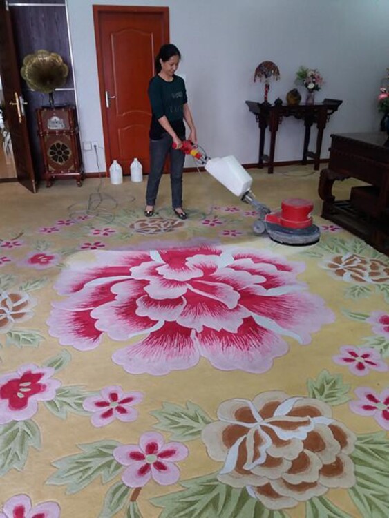 干洗泡沫包括在干洗后立即在地毯表面上鋪上清潔泡沫毯。使泡沫靜置10分鐘,以使化學(xué)試劑影響地毯。該方法通常用于去除表面的油脂;有些泡沫具有增色劑、保護(hù)劑和防污劑。這不是完全干燥的方法,因?yàn)榕菽?0%的空氣和10%的液體。干泡沫機(jī)由壓力罐組成,在其中添加了水和洗發(fā)劑的溶液。此方法用于對(duì)水敏感的地毯、針刺氈和其他類(lèi)型的地毯,這些地毯的結(jié)構(gòu)會(huì)阻礙足夠的水分提取。