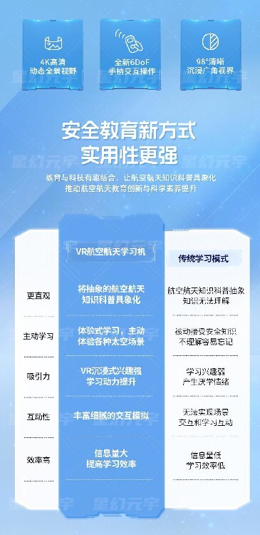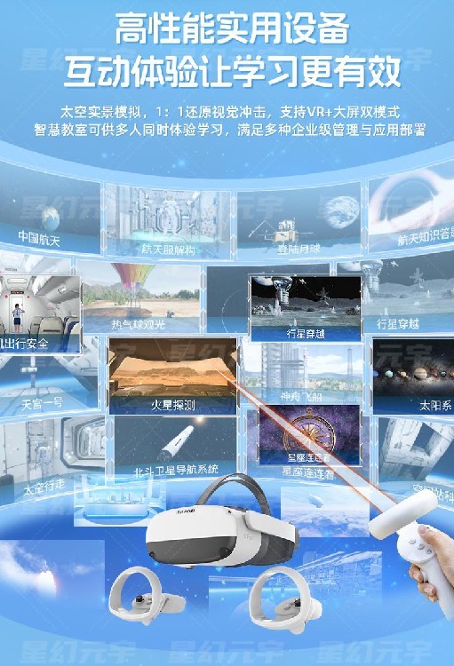 傳統(tǒng)教學多以文字、圖像為主,較難呈現(xiàn)宏觀太空環(huán)境。VR學習機可以將看不見、難模擬的內(nèi)容具體化、生動化,大幅提高學習效率。