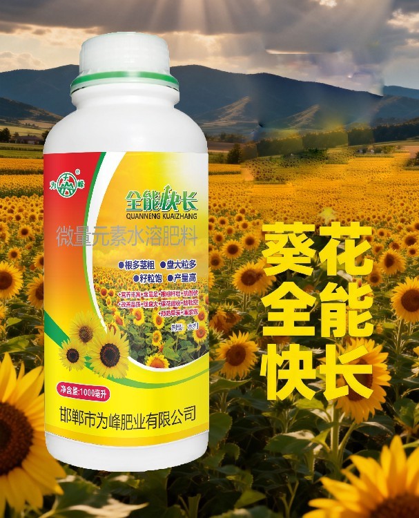 想讓葵花盤大粒多、籽粒飽滿?試試快長——葵花葉面肥!本品針對向日葵各階段需求科學配比,富含銅、鋅、硼等多種中微量元素,配合進口助劑,有效促根壯苗、提升抗逆。使用后葉片油綠肥厚,莖稈粗壯有力,花粉質(zhì)量改善,授粉更充分。為峰肥業(yè)專注作物營養(yǎng),誠邀合作伙伴攜手推廣這款多元素葉面肥,共贏葵花豐收市場!