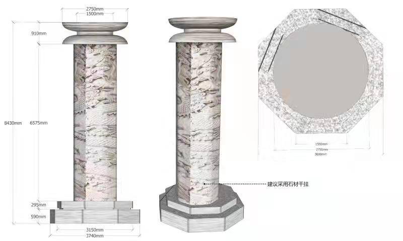 文化柱的形態(tài)是它向人們展示的直觀的外在形式元素。它給人的視覺沖擊是許多元素中大的,因此也需要強(qiáng)調(diào)。厚石浮雕是支撐藝術(shù)形式的元素。因?yàn)槲幕е蠖喾旁谑彝?,可以說石頭的選擇決定了文化支柱的生命周期。不同的材料給人們帶來不同的色彩和紋理,賦予雕塑的視覺表現(xiàn)靈活性。一般來說文化柱的藝術(shù)形式以方形或圓形為主。根據(jù)整個(gè)柱的結(jié)構(gòu)自上而下可分為四種類型:單節(jié)、兩節(jié)、三節(jié)和復(fù)合型。單截面類型是一種相對簡單的形式。一些列由小的柱基支持,而其他列則不受支持。