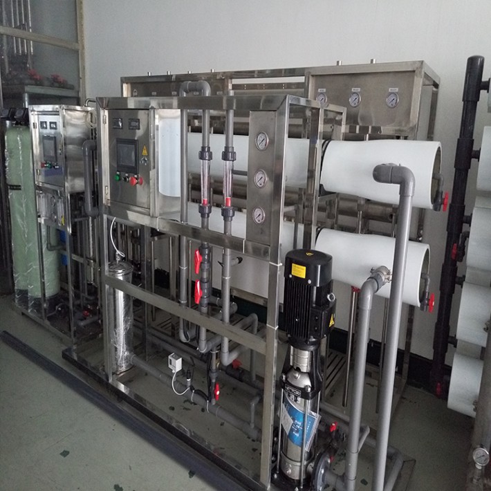 四、RO反滲透主機(jī)系統(tǒng):設(shè)備主要是由膜前加壓泵、RO膜殼、RO反滲透膜(常用RO膜可分4040型和8040型)、全自動(dòng)控制電器電路等組成,是整個(gè)反滲透水處理系統(tǒng)中的核心部分,設(shè)備出水水質(zhì)的好壞也取決該部分。只要RO膜的型號(hào)及加壓泵的型號(hào)選取得當(dāng),RO反滲透主機(jī)對(duì)水中鹽分的過濾能力都能達(dá)到98%以上,一般RO反滲透設(shè)備的出水電導(dǎo)率可在10us/cm(25°)以內(nèi)。如對(duì)水質(zhì)要求更高,可在反滲透設(shè)備后面增加二級(jí)RO反滲透設(shè)備+EDI膜堆+拋光樹脂等工藝,使出水水質(zhì)可達(dá)到18.25兆歐的超純水。