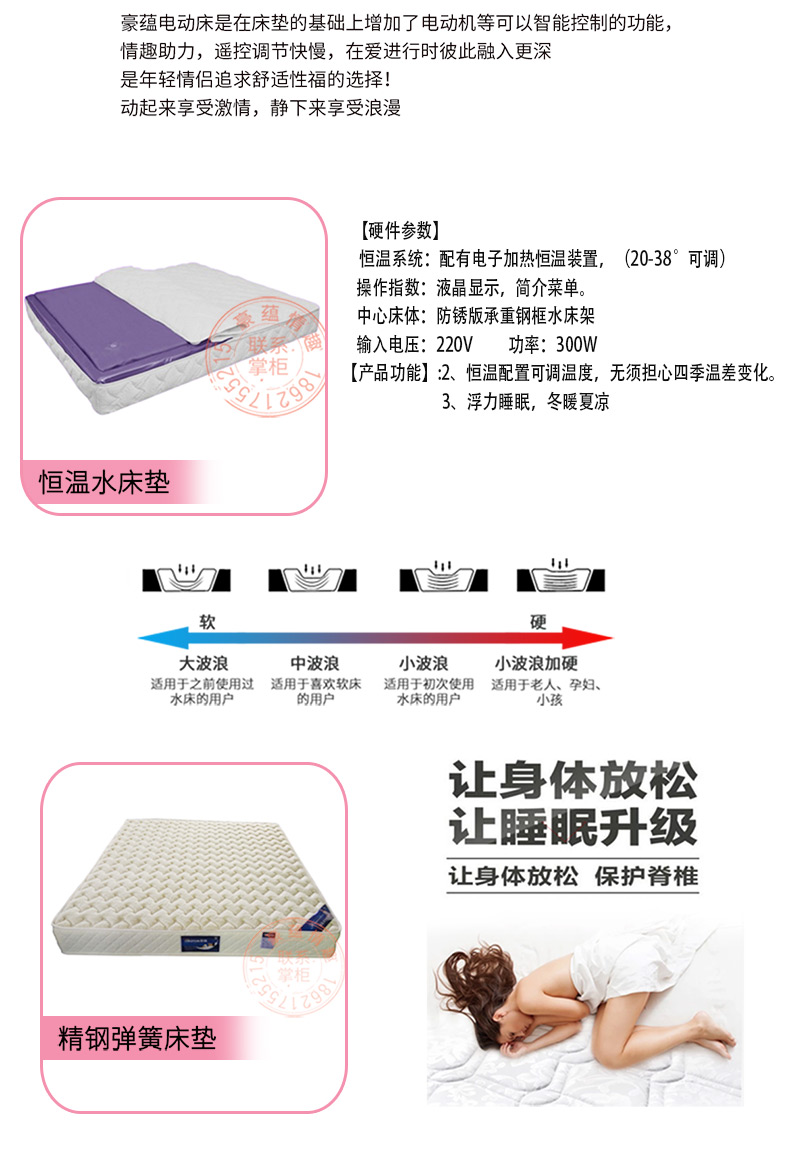 本公司主營(yíng)酒店水床,電動(dòng)床,主題酒店家具及桑拿用品等,公司自成立以來秉承自產(chǎn)自銷模式,產(chǎn)品價(jià)格實(shí)惠,款式新穎多樣,可根據(jù)房間裝修風(fēng)格及個(gè)人喜好定制款式\顏色及材質(zhì),深受新老客戶的喜愛,
