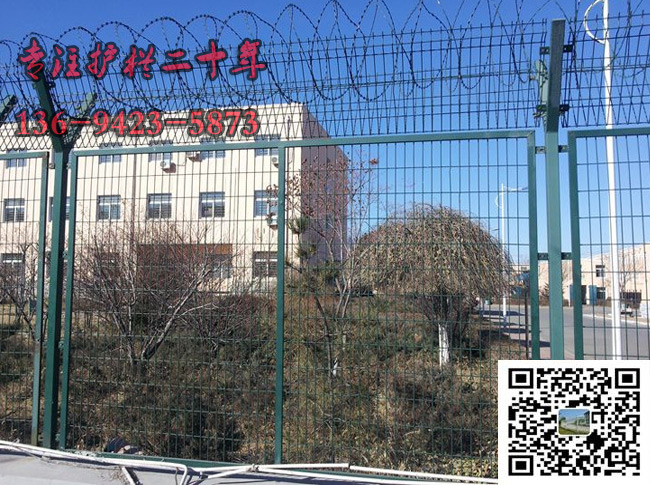 監(jiān)獄密紋圍欄網(wǎng)網(wǎng)片 絲徑 4.5mm浸塑后 網(wǎng)孔 90mm x 200mm 1.8米x3米 V型網(wǎng)片 單邊0.4米x3米 Y型立柱 塑前1.5mm 60x60方管 立柱高2.4米 頂部刀片刺繩