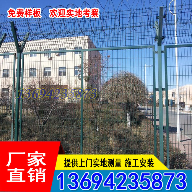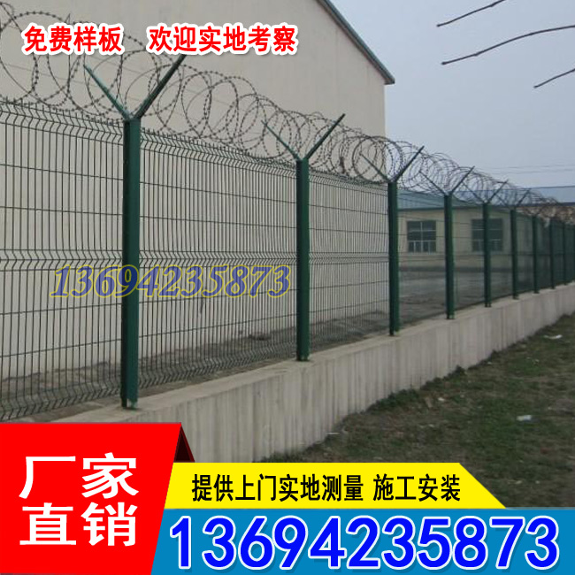 監(jiān)獄密紋圍網(wǎng) 又稱作“Y型安全防御護(hù)網(wǎng)”,是由V型支架立柱,加強(qiáng)型焊接片網(wǎng),安全防盜連接件和熱鍍鋅刀片刺籠組成強(qiáng)度和安全防御性級別很高。近年來,被廣泛應(yīng)用在機(jī)場,軍事基地等高安全場所。注:如果在機(jī)場護(hù)欄網(wǎng)頂部加裝刀片刺絲、刀片刺繩后又很好的增強(qiáng)了安全防護(hù)性能。采用電鍍、熱鍍、噴塑、浸塑等防腐形式,具有很好的、抗曬、耐候等特點(diǎn)。其產(chǎn)品造型美觀、花色多樣,既起到圍欄作用,又起到美化作用。由于具有安全性高、防攀爬能力好,網(wǎng)片連接方式采用特制SBS緊扣件,有效防止人為的破壞性拆卸,橫向四道折彎加強(qiáng)筋,使網(wǎng)面強(qiáng)度顯著增加。