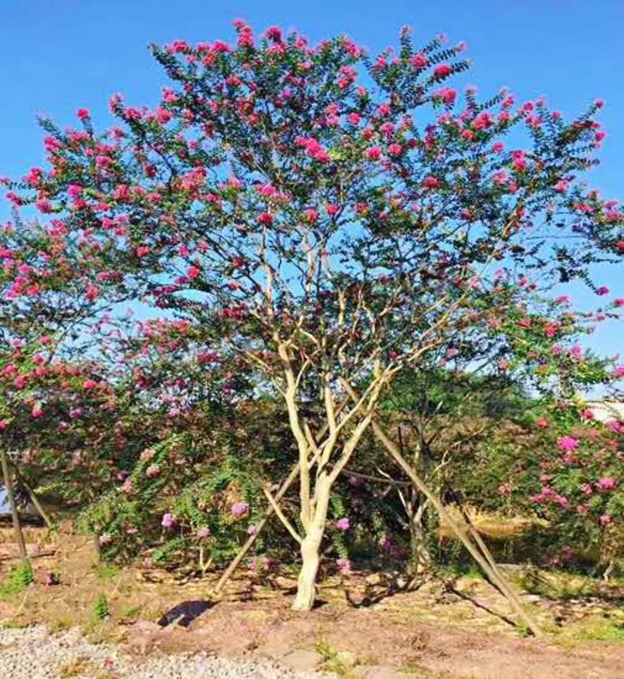 叢生紫薇,大規(guī)格叢生紫薇苗以花瓣藍(lán)色的翠薇佳,為圓錐花序,著生新枝,長(zhǎng)達(dá)20厘米,每朵花6瓣,瓣多皺襞,似一輪盤?;ㄩ_滿樹,艷麗如霞,故又稱滿堂紅。結(jié)果為蒴果,狀如大豆,內(nèi)有種子多粒,11月成熟。